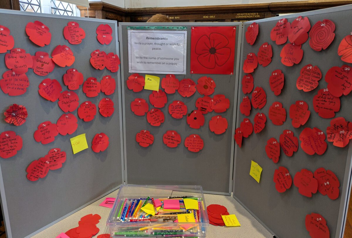 They have written names, thoughts, prayers, and wishes for peace on poppies, creating a powerful display of remembrance within our school community.